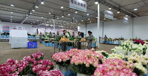 △云南麗江現代花卉產業園內,工人正在分類整理鮮花。