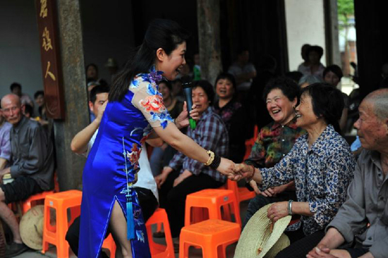 隨后,音樂、舞蹈、戲曲等藝術家們聯手為當地群眾送上了一臺精彩的文藝演出。深受當地群眾喜歡的婺劇表演、變幻莫測的變臉和魔術、驚險刺激的雜技、優美曼妙的舞蹈、令人捧腹的獨角戲、歡快喜悅的嗩吶和旋律優美的徽胡,讓葉店村的群眾看得如癡如醉、大呼過癮。整臺演出在浙江歌舞劇院女高音歌唱家、國家一級演員鄭培欽《洪湖水浪打浪》和《花兒為什么這樣紅》的歌聲中被推向高潮。