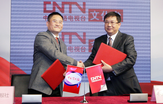 11月14日,中國文藝網和CNTV文化社區開通儀式在京舉行。圖為中國藝術報社和中國網絡電視臺在上線開通儀式現場簽署戰略合作協議。中國文藝網 孟祥寧 攝