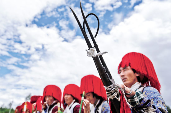 近日,西藏山南地區(qū)貢嘎縣吉那鄉(xiāng)農(nóng)民身著盛裝,歡度一年一度的“望果節(jié)”,祈禱五谷豐登。在藏語里,“望”意為田頭,“果”意為轉(zhuǎn)圈。望果節(jié),就是繞田地轉(zhuǎn)圈、祈求豐收的節(jié)日。如今的“望果節(jié)”已從宗教儀式為主的傳統(tǒng)農(nóng)耕文化節(jié)日演變?yōu)橐再愸R、歌舞、文藝、體育、商貿(mào)集于一體的節(jié)日,豐富了藏族農(nóng)民的物質(zhì)文化生活。