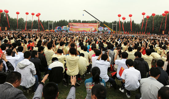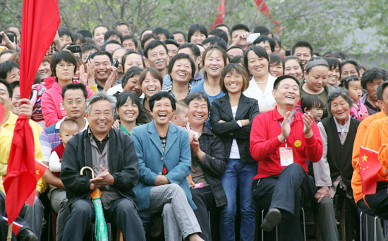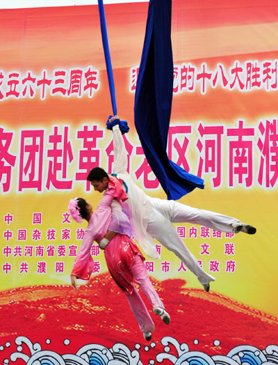 演出在濮陽市雜技藝術學校、濮陽市雜技團等表演的歌舞《龍騰神州》的喜慶旋律中拉開帷幕。姜昆與戴志誠合說的相聲《歡歌笑語》,姜克美表演的京胡獨奏《夜深沉》,中國雜技團有限公司帶來的雜技《俏花旦——抖空竹》,劉蘭芳演出的評書《張飛請孔明》,汪荃珍演唱的豫劇《抬花轎》選段,遂寧市雜技團演出的雜技《比翼——雙人倒立技巧》,高保利演唱的《山丹丹開花紅艷艷》,劉全和、劉全利帶來的滑稽小品《兄弟拍電影》,焦健東、石磊表演的口技,濟南市雜技團演出的《空中彩綢》,李彥培帶來的《變臉》,殷秀梅演唱的《在希望的田野上》以及她與毋攀合唱的《走向復興》等節目,在牛群、鞠萍幽默詼諧的主持串聯下一一奉上。臺上演員賣力地演出,臺下觀眾們臉上洋溢著開心的笑容,這些觀眾來自濮陽的各行各業,有石油工人,有醫護人員,有公安干警,有老師和學生,有農民、外來務工人員……而坐在觀眾席第一排身披紅色綬帶的老紅軍、優秀黨員、道德模范和勞動模范,尤為搶眼。最后,演出在現場兩萬余人共同高歌《歌唱祖國》的壯觀景象中落下帷幕?!翱戳私裉斓难莩?,我的心情可以用一句歌詞來形容:咱老百姓今兒個真高興!”濮陽市人民醫院的小張護士臉上露出一個大大的笑容。