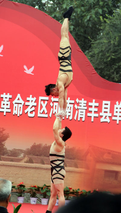 小分隊赴清豐縣單拐村演出。圖為遂寧市雜技團的演員為村民演出雜技