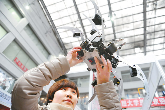 12月15日,哈爾濱石油學(xué)院大學(xué)生在演示他們設(shè)計(jì)制作的蜘蛛型偵查勘探機(jī)器人。當(dāng)日,2012全國大學(xué)生創(chuàng)新設(shè)計(jì)大賽在哈爾濱工程大學(xué)舉行。由全國36所高校1000多名大學(xué)生精心設(shè)計(jì)創(chuàng)作的參賽作品達(dá)310件。一件件設(shè)計(jì)精美、功能實(shí)用和較高科技含量的作品,充分地展示了當(dāng)代大學(xué)生熱愛生活參與生活,挑戰(zhàn)自我追求夢想的才能。