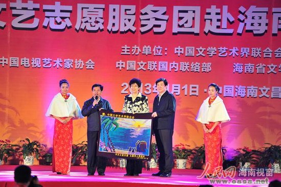 在慰問演出前,中國文聯和文昌市領導分別致詞,并互贈送紀念品。