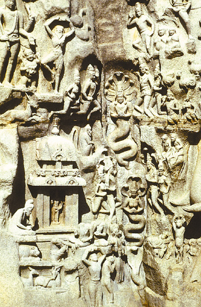 印度的蛇神通稱那伽(蛇),漢譯佛經(jīng)誤譯為“龍”,那伽也被列為護(hù)佛的“天龍八部”之一。在古代印度佛教和印度教雕刻中,那伽的形象通常都是人首蛇身,頭上有5個(gè)或7個(gè)眼鏡蛇頭兜,狀如光環(huán)或華蓋。南印度馬哈巴利普拉姆的巨巖浮雕《恒河降凡》(約公元670年)在代表恒河的瀑布中暢泳的男女蛇神形象,就是典型的一例。