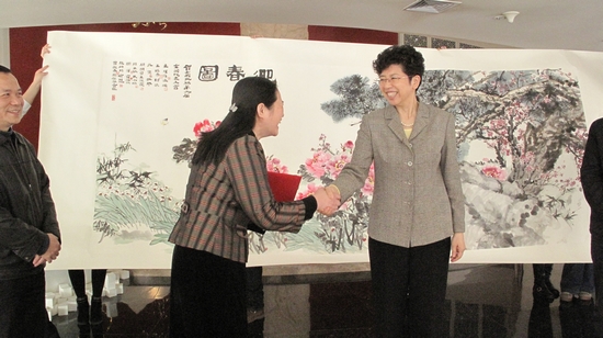 3月8日,中國美協(xié)、中國女畫家協(xié)會向中國文藝家之家捐贈女畫家集體創(chuàng)作丈二花鳥《迎春圖》。中國文聯黨組書記、副主席趙實,中國文聯黨組成員、副主席左中一和劉尚軍、張旭光、陶勤以及孔紫、王迎春、朱理存等畫家代表出席捐贈儀式。