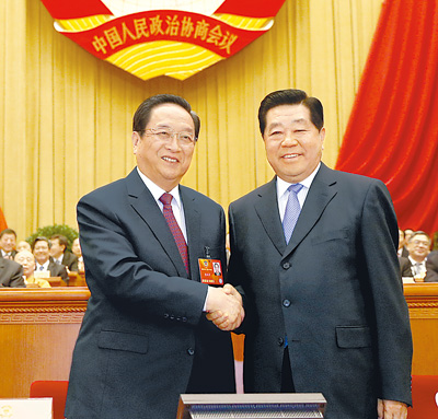 3月11日,全國政協(xié)十二屆一次會議在北京人民大會堂舉行第四次全體會議,俞正聲當(dāng)選政協(xié)第十二屆全國委員會主席。這是政協(xié)第十一屆全國委員會主席賈慶林和俞正聲親切握手,表示祝賀。 新華社記者 鞠 鵬攝