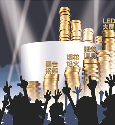 郭瓦加毛吉粗算了一筆賬:搭個鋼架至少要上百萬元,LED大屏也要上百萬元,煙花焰火、多媒體視頻等也至少要幾百萬元,加上服裝道具,40多個節(jié)目的晚會怎么也要幾百萬元,這就要上千萬元了……這里面還不算邀請明星的費用和安保等其他成本。
