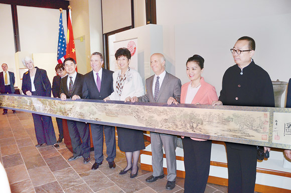 美國當地時間5月8日17時30分,中國民間文化周開幕式在美國達拉斯克羅亞洲藝術博物館舉行。圖為開幕式后,中國文聯副主席趙實向主辦單位贈送精美藝術品。李剛 攝