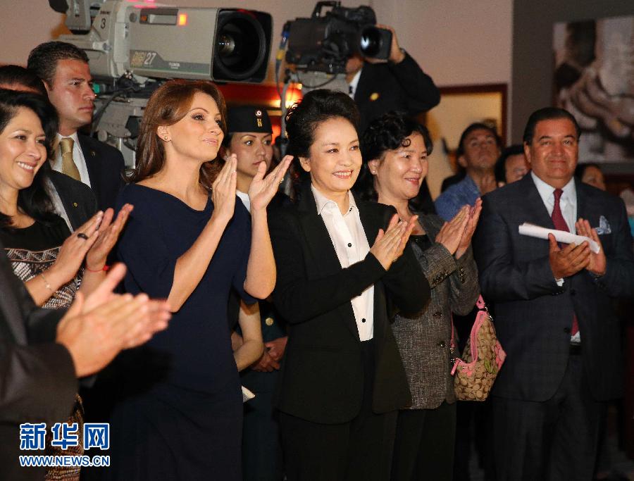 6月5日,中國國家主席習近平夫人彭麗媛在墨西哥總統夫人里韋拉陪同下,來到墨西哥特萊維薩電視臺電視劇制作中心參觀。 新華社記者 丁林 攝