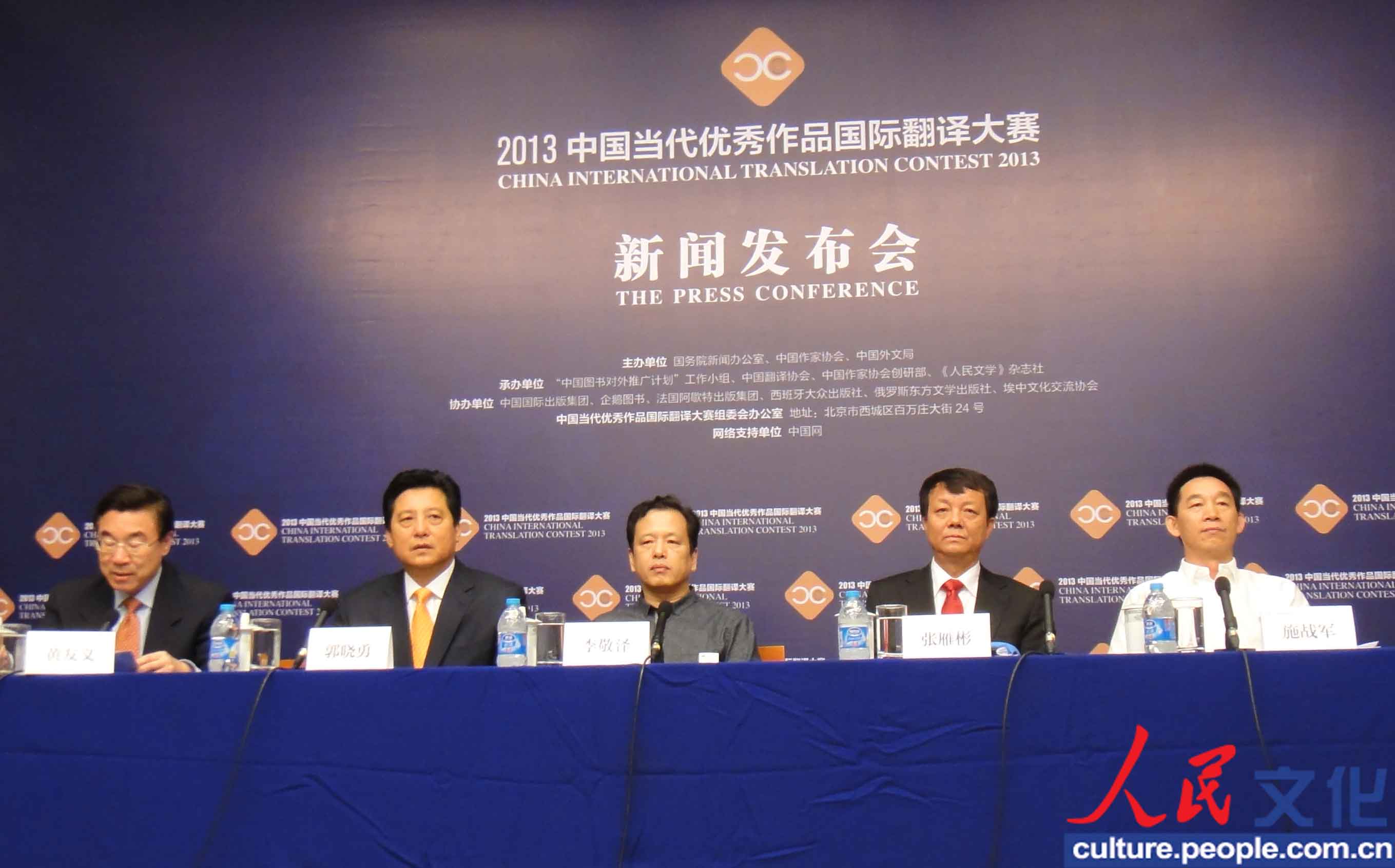 由國務(wù)院新聞辦公室、中國作家協(xié)會和中國外文局聯(lián)合主辦,“中國圖書對外推廣計(jì)劃”工作小組、中國翻譯協(xié)會、中國作家協(xié)會創(chuàng)研部和《人民文學(xué)》雜志社承辦的“2013中國當(dāng)代優(yōu)秀作品國際翻譯大賽”啟動儀式在京舉行。國務(wù)院新聞辦公室三局局長張雁彬,中國作協(xié)黨組成員、書記處書記李敬澤,中國外文局常務(wù)副局長郭曉勇等出席了大賽啟動儀式。