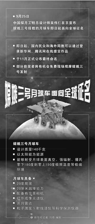 嫦娥三號探測器預計將于今年12月發(fā)射,其承擔月面巡視探測任務的中國第一輛月球車(月球巡視探測器)同樣備受矚目。這輛月球車究竟是什么樣?它將怎么進行它的“探月之旅”?又會完成哪些科學任務?25日,在北京舉行的嫦娥三號月球車全球征名活動上,這些問題一一得到解答。