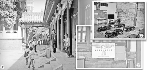 圖①:孩子們課間在文廟玩耍。圖②:文廟廂房被改造成教室。圖③:幼兒園的招生廣告。制圖:宋嵩