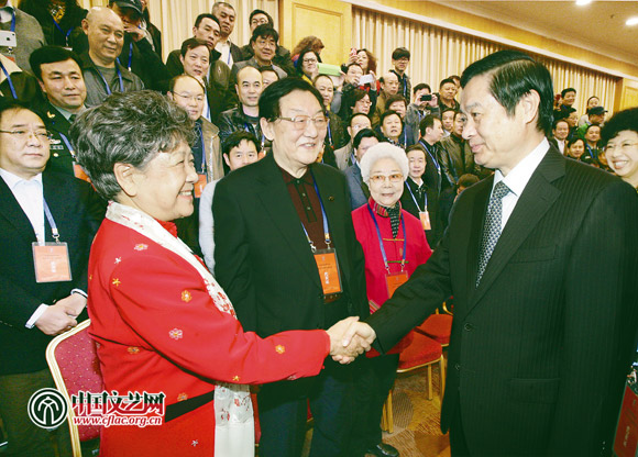 11月29日,中國電影家協(xié)會第九次全國代表大會在京開幕。中共中央政治局委員、中央書記處書記、中宣部部長劉奇葆(右)親切接見與會代表。中國藝術記者 孟祥寧 攝