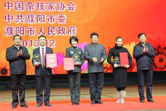 12月27日,第八屆中國雜技金菊獎第三次劇目獎頒獎儀式在河南濮陽舉行。圖為與會領(lǐng)導給獲獎單位頒發(fā)證書。中國文藝網(wǎng) 何瑞涓 攝