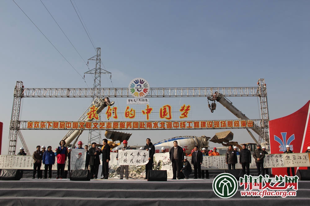 享受到藝術家不遠千里送來的精美文化大餐,湍河渡槽工程項目經理陳謀建倍感激動。他告訴記者:“南水北調工程是一項功在當代、利在千秋的工程,自己能夠有幸參與其中倍感自豪。我們這些水利工人常年在野外作業,工期緊、任務重,很難有機會看到藝術名家的表演,歲末年初,中國文聯組織這么多藝術家來到我們身邊,不僅為我們送來了最美好的新年祝福,更為工地所有的建設者帶來一股十分強大的精神動力。 ”