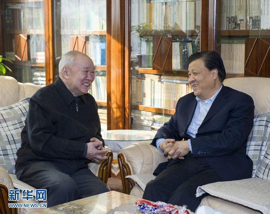 1月26日下午和27日上午,中共中央政治局常委、中央書記處書記劉云山代表習近平總書記和黨中央看望文化界知名人士,向他們致以誠摯問候,向廣大文化工作者致以新春祝福。這是1月26日,劉云山看望中國藝術研究院原副院長、著名紅學家馮其庸。 新華社記者王曄攝