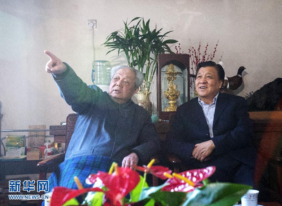 1月26日下午和27日上午,中共中央政治局常委、中央書記處書記劉云山代表習近平總書記和黨中央看望文化界知名人士,向他們致以誠摯問候,向廣大文化工作者致以新春祝福。這是1月27日,劉云山看望中國文聯榮譽委員、著名京劇表演藝術家李世濟。 新華社記者黃敬文攝
