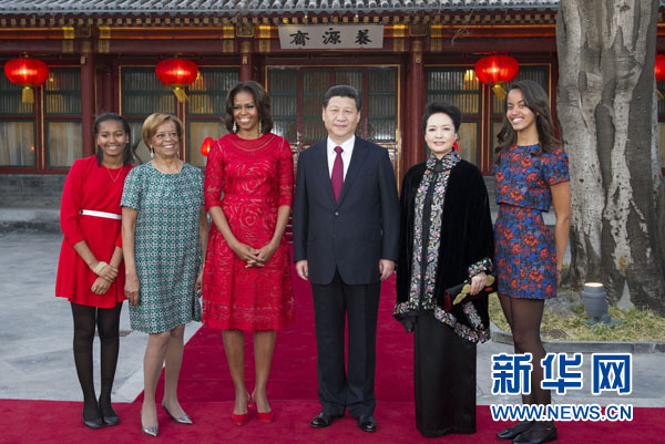 3月21日,國家主席習近平和夫人彭麗媛在北京釣魚臺國賓館會見美國總統奧巴馬夫人米歇爾。這是習近平和彭麗媛同米歇爾女士、米歇爾女士的母親羅賓遜夫人(左二)、女兒瑪麗亞(右一)和薩莎(左一)合影。新華社記者 黃敬文 攝