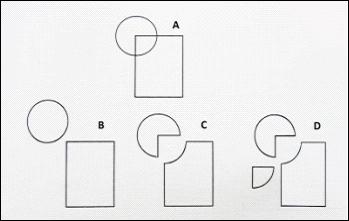圖5.顯示了一個圓與矩形重疊(如A)。這個圖形,我們眼睛會假設它是一個圓與一個矩形的重疊(如B),而不會把它看成復雜圖形的組合,如圖C或圖D.。這種力求簡明的判讀,稱之為簡單律。