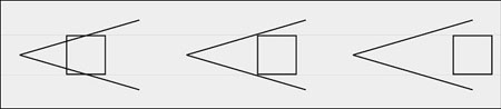 圖8.我們看到三個圖形。這三個圖形中的正方形是一樣的,可是正方形越接近ㄑ形,正方形的右邊看起來會越短,形成了向右倒的梯形。主要的原因,是我們的眼睛想藉正方形右邊的變短,來平衡ㄑ形右邊的變寬。圖8.說明,我們眼睛對「平衡」是很敏感的。