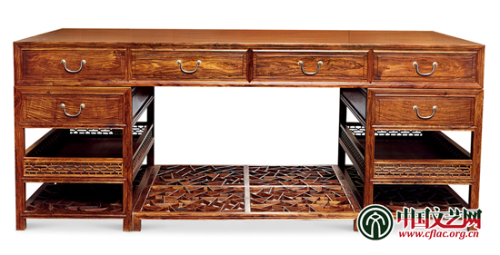 注解:此桌黃花梨制,平列抽屜四具,兩旁又架幾各置一具,層層重迭,可做書桌。方腿,之間設橫棖,其內以短材拼接相連呈冰裂紋。另制冰裂紋腳踏置于兩個臺架中間。整體造型穩重大方,做工與用料講究,色澤古雅,空間開闊,便于搬運。此種書桌適宜靠窗放置,書畫閱讀,清雅別致。