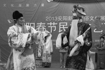 在新春佳節(jié)期間舉辦的2013年河南省安陽市蛇年新春民俗文化系列產(chǎn)品展會(huì)上,河南省林州市新藝四股弦劇團(tuán)帶來了《忠保國(guó)》等傳統(tǒng)劇目和新編劇目,使得當(dāng)?shù)貞蛎耘笥延致牭搅司眠`的林州四股弦。