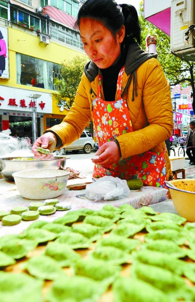 3月27日,江西省德興市銀城街道一名攤主在制作“艾果”準備出售。