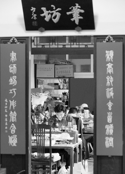 與琺瑯廠“廠中設(shè)店”有異曲同工之妙,2007年,京城老字號戴月軒恢復(fù)了“前店后廠”經(jīng)營模式。走進(jìn)戴月軒,古樸典雅的店鋪柜臺后面連著一個“筆坊”,人們可以靜觀“筆坊”內(nèi)制筆師傅們“千萬毛中撿一毫”的制筆技藝,親眼領(lǐng)略一支毛筆從選材到制成所經(jīng)過的上百道工序。于天鶯說,之所以把毛筆的整個流程都搬到店里,并且建成開放式的,就是想讓顧客看到整個工藝制作流程,知道好的毛筆是怎樣做出來的,并感受筆工做筆那份“毫雖輕,功甚重”的辛苦。