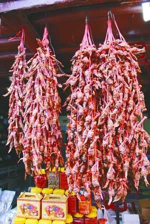 高淳老街是一個讓人放慢腳步的地方,安安靜靜,它是江蘇省保存最完整的的明清古街。老街能留住人的腿,也能留住人的胃,老街上有不少美食,比如說鴨腳包。這是我第一次見到這種東西,成串成串地捆起來吊在房檐下,漬紅的顏色分外誘人。聽當地人說,將經過特殊腌制的鴨掌里放一塊鴨心,然后用鴨腸綁起來,就是鴨腳包了。吃時放在籠屜里蒸熟,筋道而令人口舌生津,煲湯時放兩個鴨腳包進去,也是別樣的美味。老街的臭豆腐有白豆腐和黑豆腐兩種,滾熱的油里一炸,澆上點佐料就可以開吃了。與臭豆腐同賣的還有小螃蟹、小魚、藕夾之類的,這就是別處豆腐攤難見的了。因老街緊鄰固城湖,固城湖的螃蟹是當地的小有名氣的特產。油炸的小螃蟹裹一層面,巴掌大小,沒了霸氣橫行的姿態,看起來有一些萌,反倒讓人不忍心下口了。