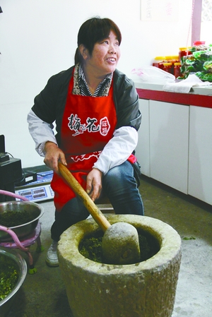 街邊一屜雪白的米糕剛剛出籠,每兩塊扣在一起,方方正正,上印花紋,像舊時人家小姐的袖珍首飾盒子。女主人正在搗著什么,石臼、石錘,綠汁飛濺,旁邊一大盆綠色頂著小黃花的野菜。我過去問,女主人和氣地說,搗的香草,是做米糕的原料之一,說著又拿米糕給我們嘗。米糕很松軟,細膩溫潤,有淡淡的米香和草香。一路上有各色的點心、各色的腌菜、各色的山野菜、湖魚水產。各個攤位上的魚頭是亮點,胖魚頭傻傻呆呆的樣子,嘴巴里卻塞了只紅彤彤的新鮮大辣椒,像是扮鬼臉吐大舌頭,愈加顯得呆傻。