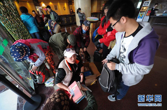 4月23日,“愛(ài)心背書(shū)客”志愿者把書(shū)裝進(jìn)背包準(zhǔn)備出發(fā)前往鄉(xiāng)村小學(xué)。