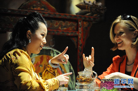 4月11日,王奕謌(左)在北京與來自美國的中國戲曲學(xué)院研究生柳素英(Elyse Ribbons)探討表演技藝。