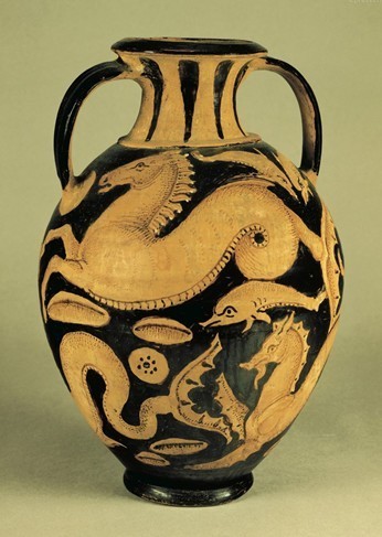 繪有海蛇的雙耳細頸橢圓土罐,古伊特魯里亞藝術品,公元前4世紀。
