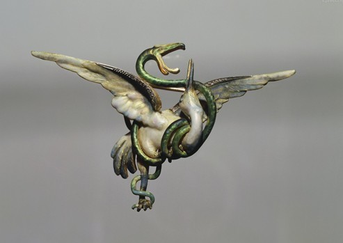 鸛與蛇的琺瑯胸針,約1900。
