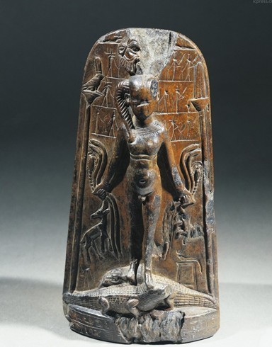 古埃及石碑,碑身刻有古埃及太陽神何露斯,雙手各抓兩條毒蛇,周身被咒語包圍,石碑被修行者用來練習抵御野獸的魔法,古埃及文明,公元前5世紀。