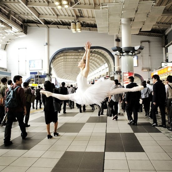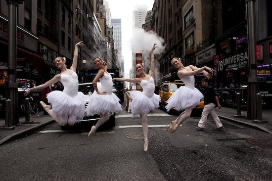 在攝影師Lisa的鏡頭中,這些美麗的舞蹈演員身穿緊身衣,芭蕾舞短裙及芭蕾舞鞋在嘈雜擁擠的街頭演繹著一個個芭蕾舞經(jīng)典動作。她們優(yōu)雅地在半空中劈叉,巧妙地用一個腳趾頭保持身體平衡,而她們的身后,是粗糙的街角,地鐵站和繁忙的購物區(qū)。這些無不給人一種現(xiàn)代擁擠吵雜和古典優(yōu)雅精致并存的視覺體驗。