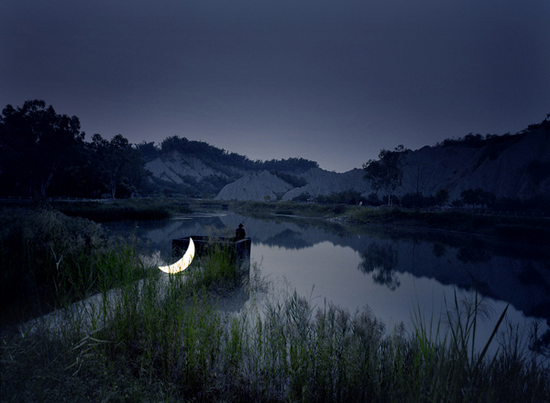 在這個系列裝置藝術作品中,他使用LED技術制作了巨型彎月,在夜晚發出明亮而均勻的光芒,創造和照亮了一個個充滿著夢幻色彩的場景。他們利用這一系列名為私人月亮(Private Moon)作品講述了一個故事:一個男人偶然間發現了月亮 ,一見鐘情,并最終如影隨行、與她共度余生。這儼然是一個荒誕不經的童話,但漂亮的視覺效果中也突顯出神秘、浪漫的氣氛。