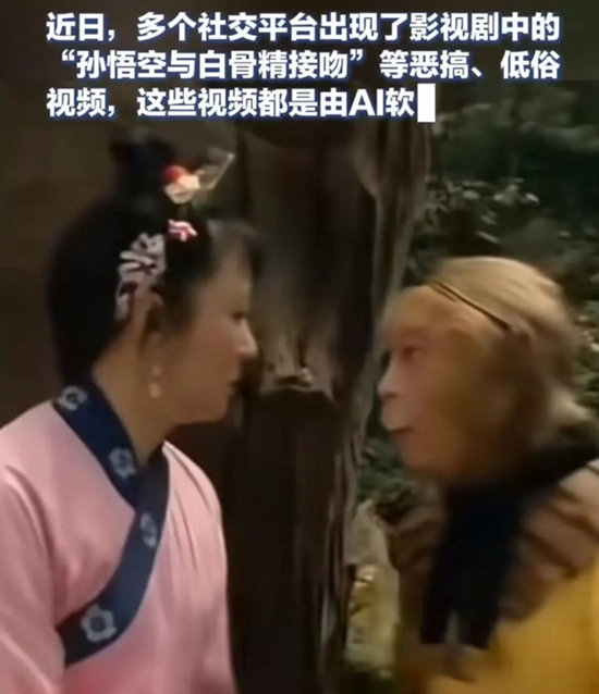 此前,“AI接吻”技術(shù)也曾在社交平臺引發(fā)爭議。不少網(wǎng)友發(fā)出的視頻中,出現(xiàn)了唐僧和女兒國國王、孫悟空和白骨精等人物擁抱接吻的惡搞低俗視頻。