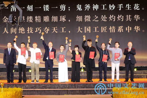 中國民協分黨組書記、駐會副主席、秘書長邱運華,中共浙江省委宣傳部常務副部長來穎杰為優秀民間工藝美術作品獲獎代表頒獎。