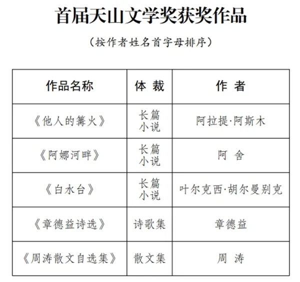5部獲獎作品分別是阿舍的《阿娜河畔》、阿拉提·阿斯木的《他人的篝火》、葉爾克西的《白水臺》、章德益的《章德益詩選》和周濤的《周濤散文自選集》。5部提名作品分別為董立勃長篇小說《可可托海往事》,吉爾詩集《我從未與世界如此和解》,李健小說集《臍血之地》,李娟散文集《記一忘三二》,周智慧散文集《解憂牧場札記》。