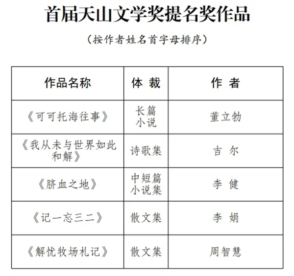 據了解,天山文學獎是天山文藝獎中的特別獎。參評作品不限體裁,長篇小說、中短篇小說、散文、紀實文學、詩歌、劇本、兒童文學、文學理論評論等均可參評。天山文學獎表彰新疆題材文學精品,旨在展現團結和諧、繁榮發展的美麗新疆,引領新疆題材文學創作不斷向高峰邁進。