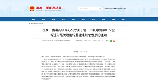 2月5日,國家廣播電視總局官網發布《國家廣播電視總局辦公廳關于進一步統籌發展和安全促進網絡微短劇行業健康繁榮發展的通知》。以下為通知全文↓↓↓↓↓