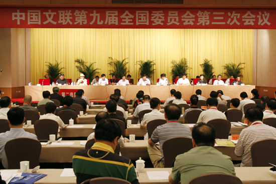 7月5日,中國文聯第九屆全國委員會第三次會議在京召開。全國政協副主席、中國文聯主席孫家正主持會議。中國文聯黨組書記、副主席趙實,中國文聯黨組副書記、副主席覃志剛、李屹,中國文聯黨組成員、副主席楊承志,中國文聯黨組成員左中一,中國文聯黨組成員、書記處書記夏潮,中組部干部三局巡視員、副局長趙凡,中宣部文藝局巡視員、副局長孟祥林,中國文聯副主席丹增、馮遠、邊發吉、劉蘭芳、李雪健、李維康、陳曉光、迪麗娜爾·阿布都拉、趙化勇、段成桂、徐沛東、奚美娟、黎國如和中國文聯主席團委員、全委會委員出席會議。中組部、中宣部有關部門負責同志,有關全國文藝家協會主席,中國人民銀行文聯負責同志,有關全國文藝家協會、中國文聯有關機關部室和直屬單位負責同志列席會議。