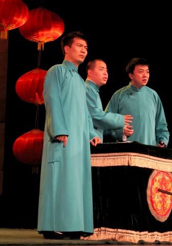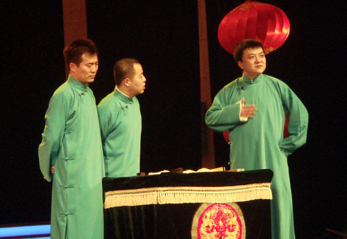 在今天(11月2日)晚上舉行的北京著名相聲曲藝團體德云社十周年慶典專場演出中,有兩位特別演員以一段《不說足球說相聲》博得了滿堂彩,他們就是央視名嘴黃健翔和著名記者董璐。他們和德云社相聲演員徐德亮自創了一段以足球和相聲為主題的段子。相聲中,黃健翔和董璐不但互倒苦水,大暴足球新聞從業者的艱辛,還把黃健翔的世界杯(世界杯新聞,世界杯說吧)“發瘋”事件和與張靚穎的緋聞加進包袱里,現場反響熱烈。