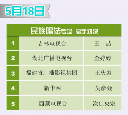 藍色經典?天之藍第十五屆青歌賽史上最激烈的青歌賽決賽即將到來!5月18日民族組高手過招,5月19日美聲組強者比拼,5月20日流行組王者爭雄。三場專場比賽,各唱法5強選手將使出渾身解數,高歌猛進!每晚19點30分,盡情享受青歌賽為您帶來的饕餮盛宴。巔峰總決賽,見證歌者加冕時刻!
