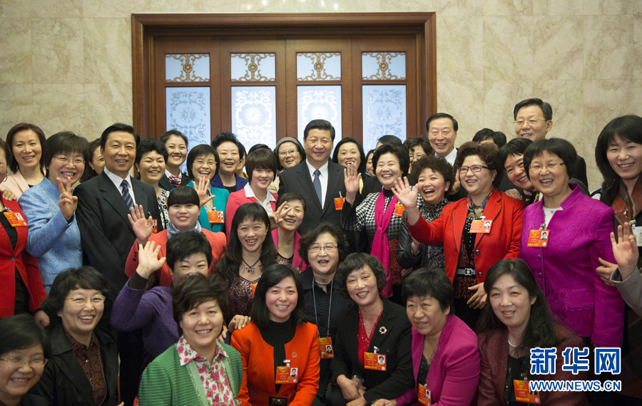 3月8日,中共中央總書記、中共中央軍委主席習近平參加十二屆全國人大一次會議江蘇代表團審議。這是習近平同女代表合影,并代表黨中央向出席兩會的女代表、女委員,向全國各族各界婦女致以節日的祝賀。新華社記者蘭紅光攝