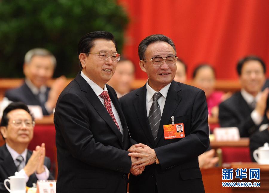 3月14日,十二屆全國人大一次會議在北京人民大會堂舉行第四次全體會議,選舉第十二屆全國人民代表大會常務(wù)委員會委員長、副委員長、秘書長;選舉第十二屆全國人民代表大會常務(wù)委員會委員;選舉中華人民共和國主席、副主席;選舉中華人民共和國中央軍事委員會主席。張德江當(dāng)選第十二屆全國人民代表大會常務(wù)委員會委員長。這是吳邦國與張德江握手。 新華社記者謝環(huán)馳攝