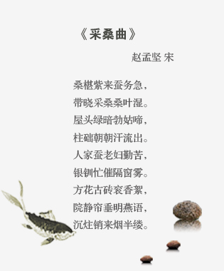 絲綢的源頭在田野。栽桑養蠶,春蠶吐絲,才有了絲綢的華貴與美麗。中國是世界上最早馴育野蠶并剿絲織綢的國家...... 【詳細】