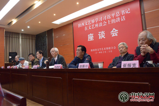 中國音樂家協會主席、陜西省文聯主席趙季平,陜西省作協副主席高建群,中國美協顧問、陜西省美協名譽主席劉文西,陜西省文聯副主席劉遠,陜西省書協名譽主席吳三大,陜西省美協名譽主席趙振川,陜西省美協副主席、西安美術學院院長郭線廬,陜西廣播電視臺著名導演萬盛華,陜西省文藝評論家協會主席李震,西安秦腔劇院易俗社社長慧敏莉,著名文藝評論家李星,陜西省曲藝家協會副主席王茵等文藝家代表先后發言,暢談了學習習近平總書記講話的體會。